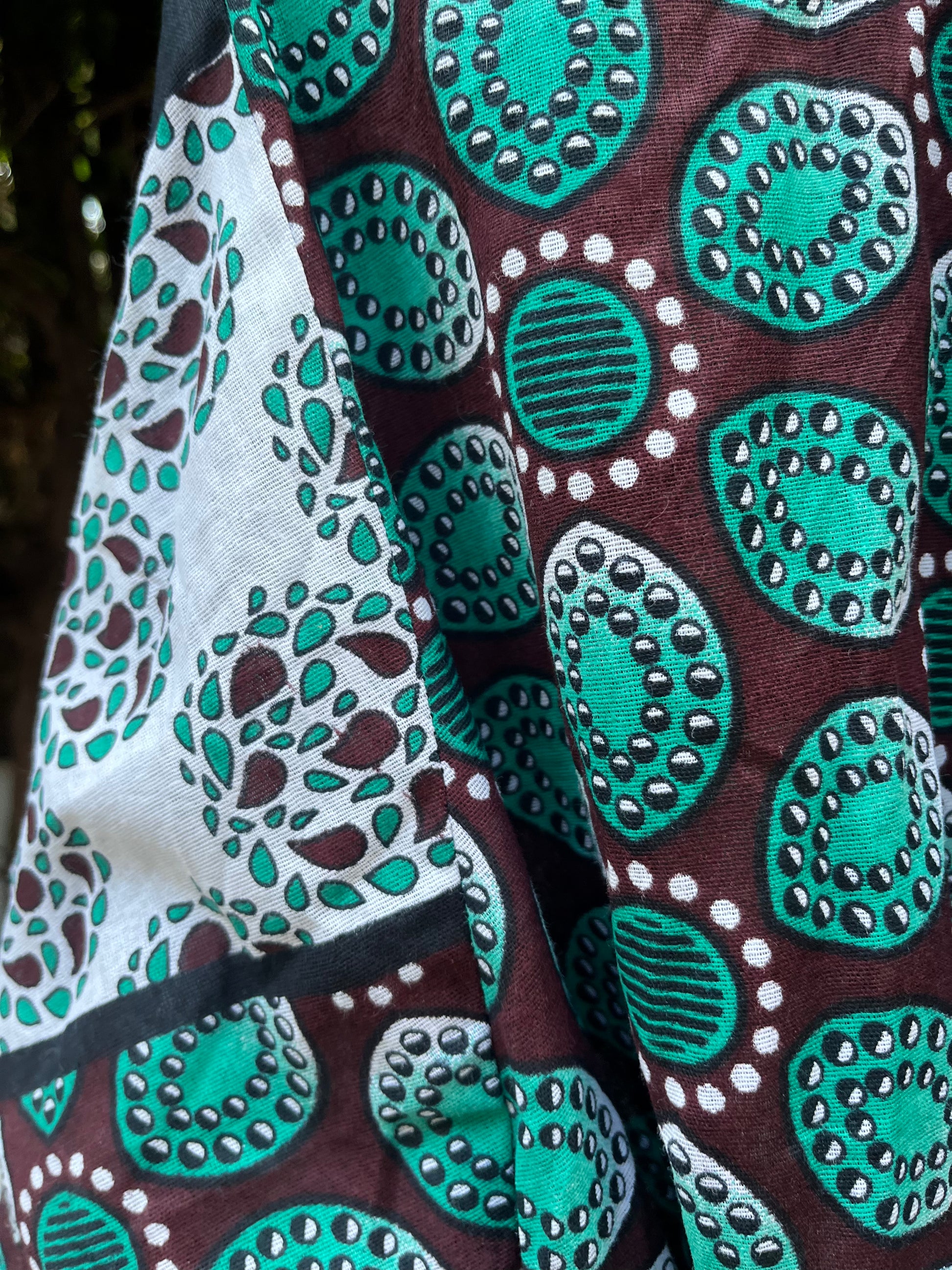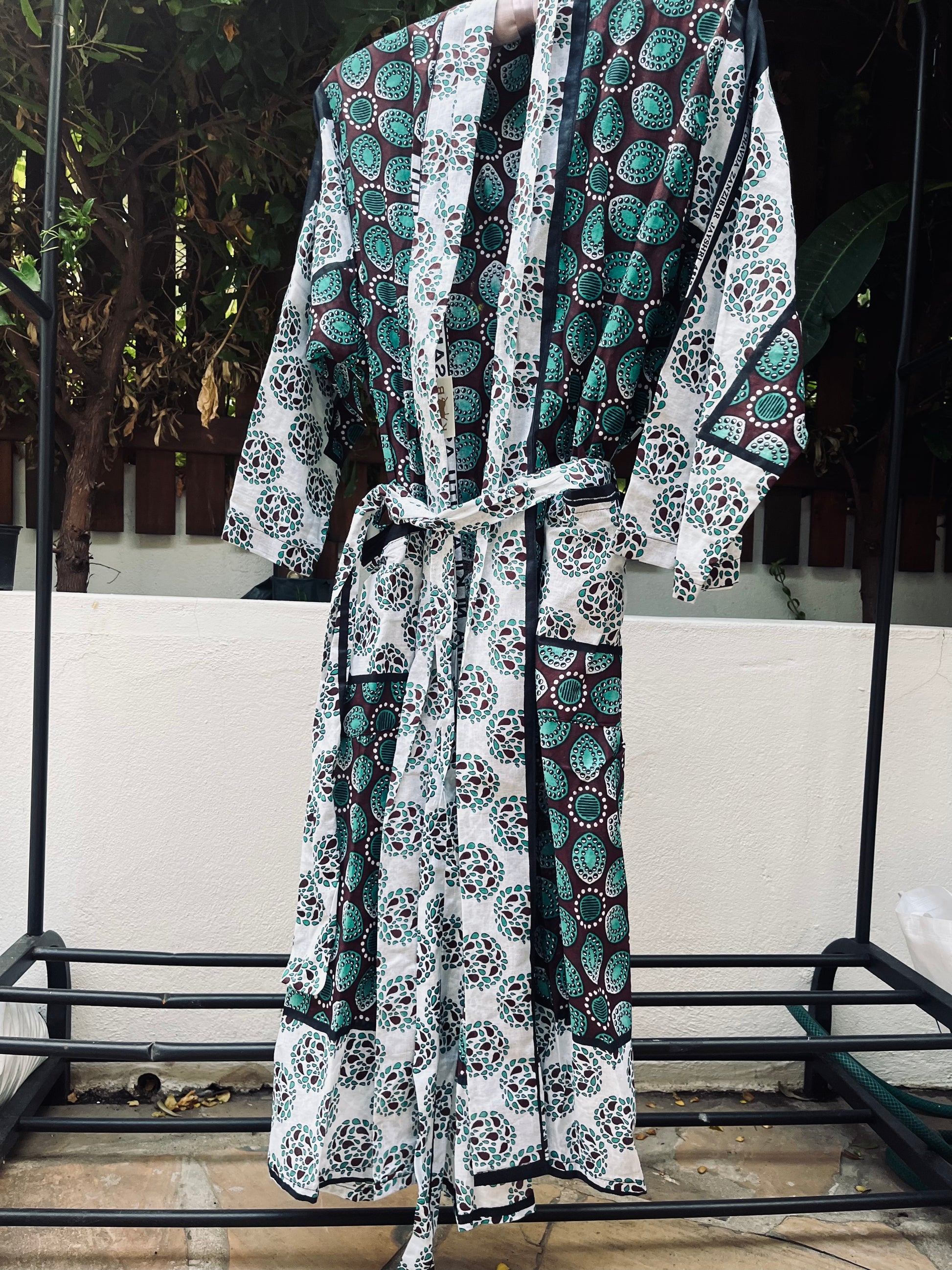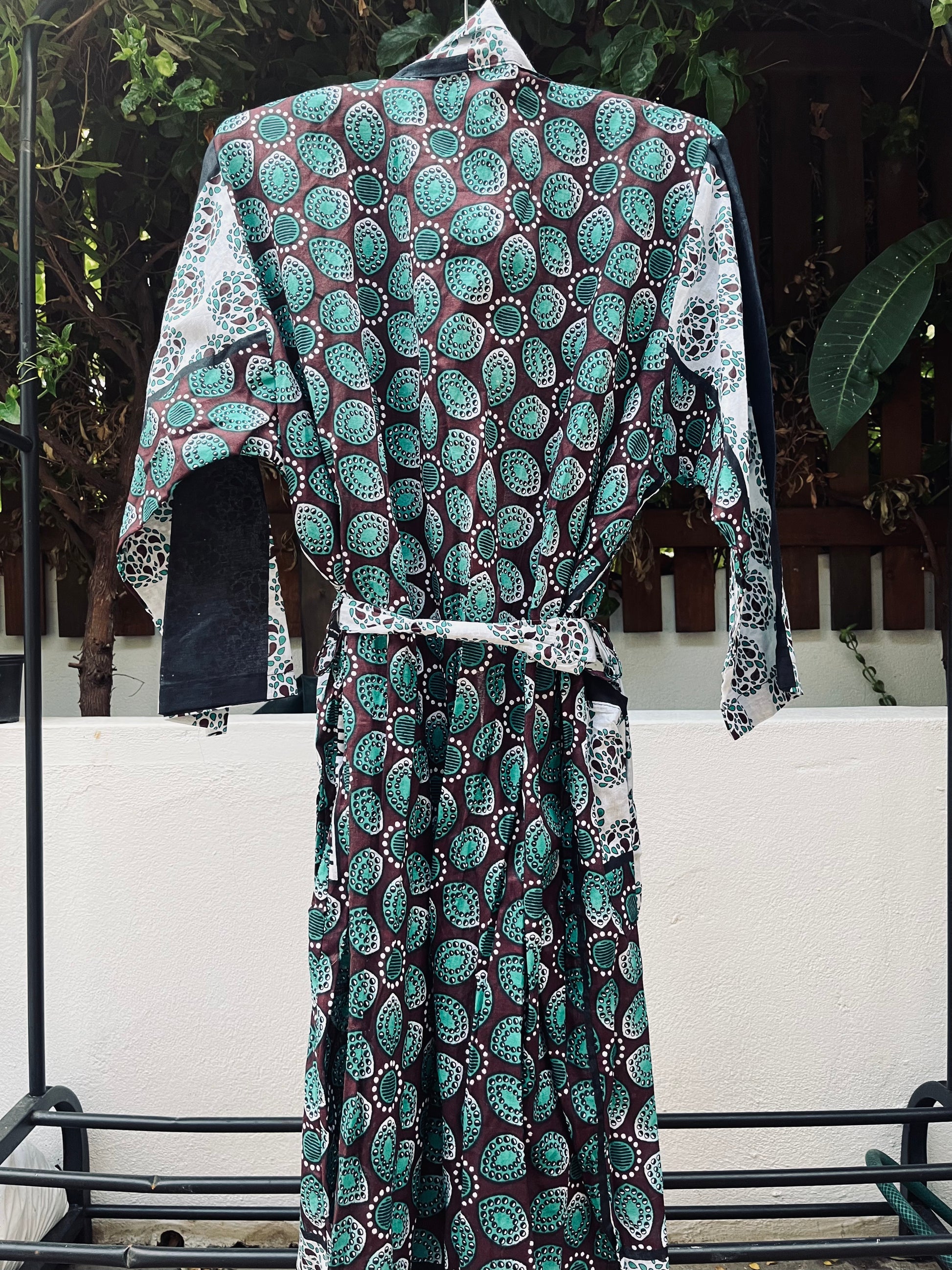 This vibrant Naku-mono kimono pulses with energy through African funk patterns in brown and green. Individually handcrafted from authentic block-printed wax cotton kanga in Zanzibar.