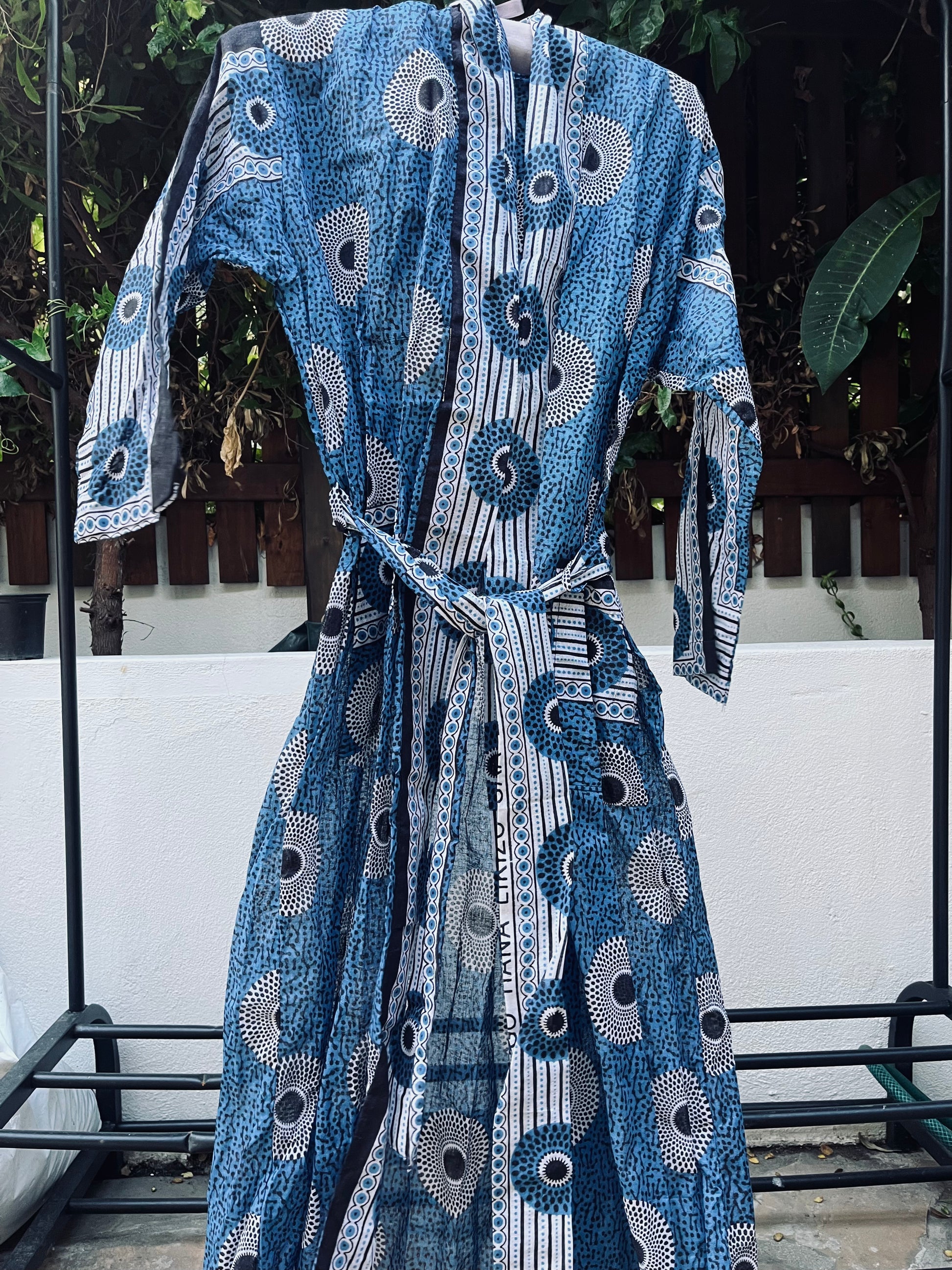 This serene Naku-mono kimono embodies peaceful harmony with calming patterns in blue, black and white. Individually handcrafted from authentic block-printed wax cotton kanga in Zanzibar.