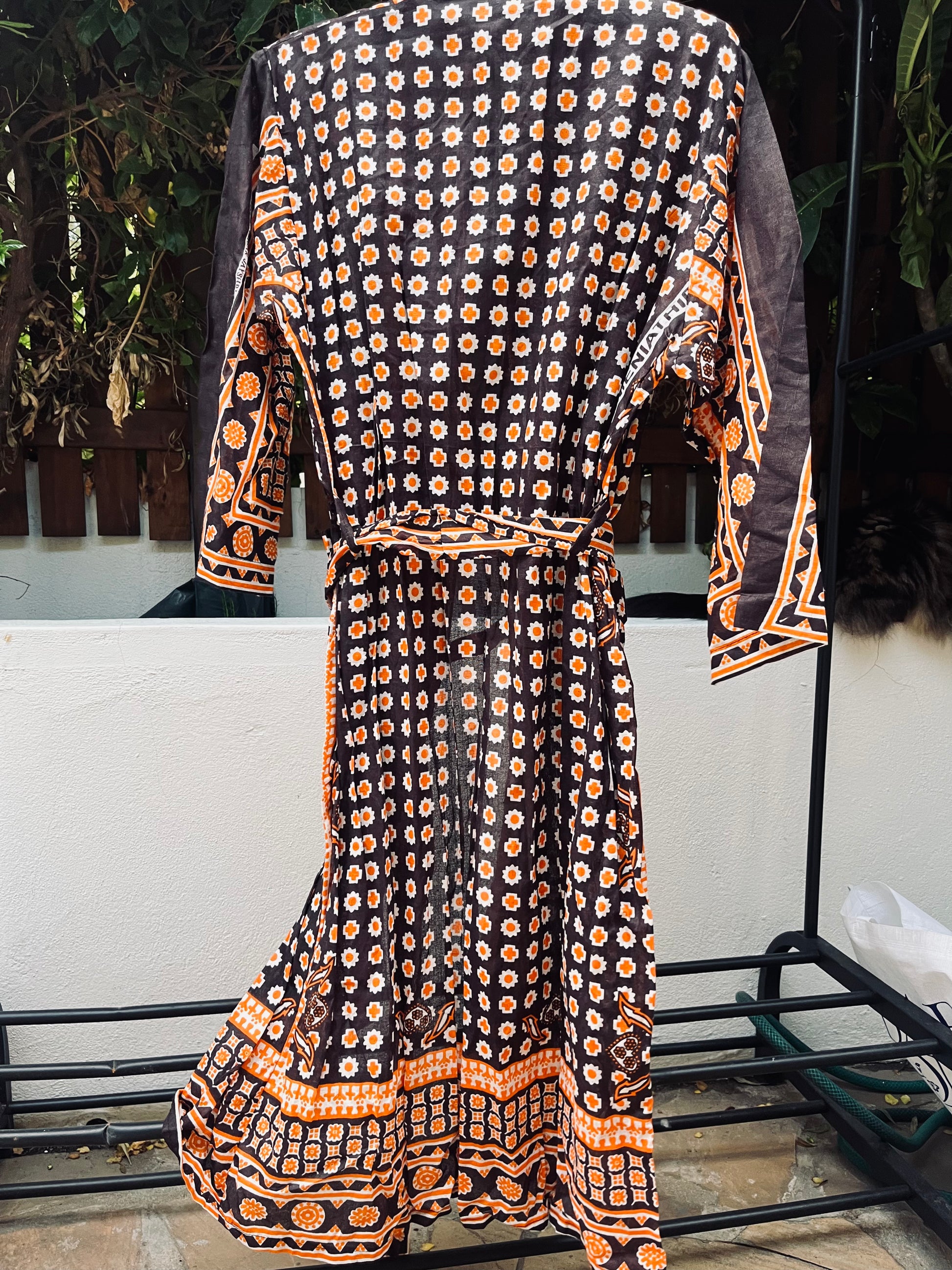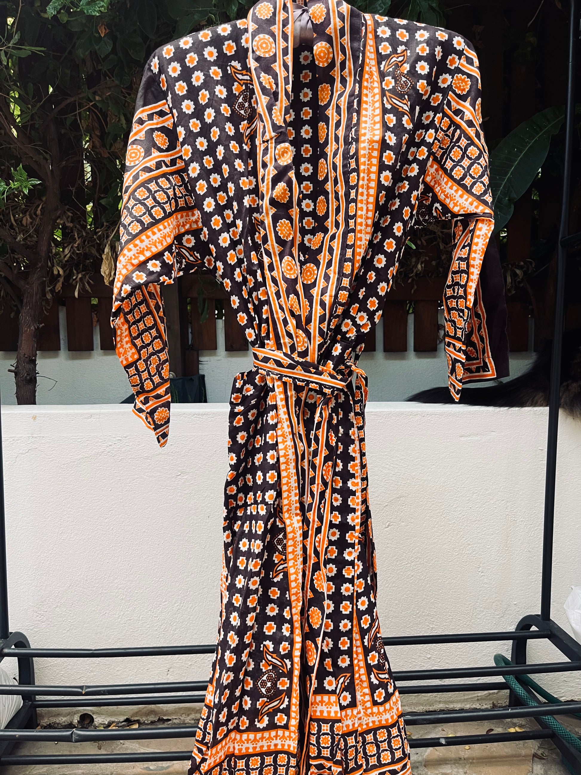This energetic Naku-mono kimono brings the funk with bold patterns in brown and orange. Individually handcrafted from authentic block-printed wax cotton kanga in Zanzibar.