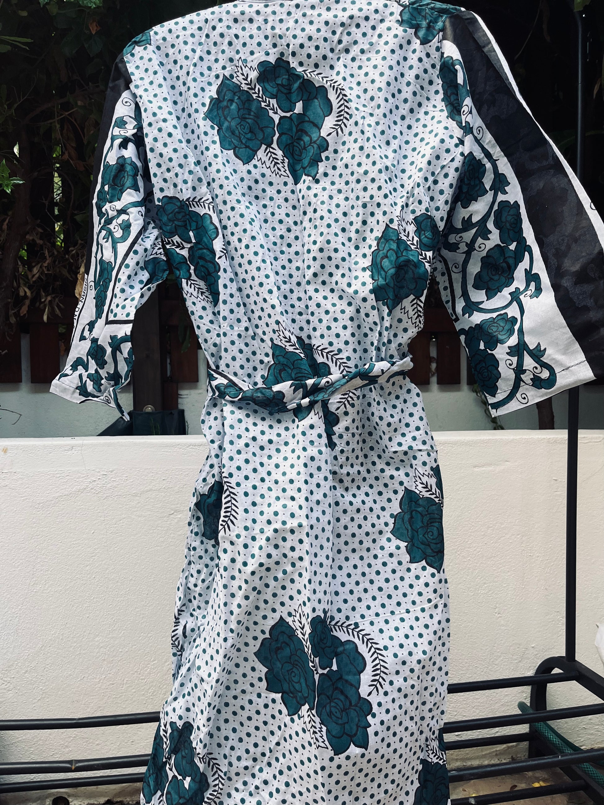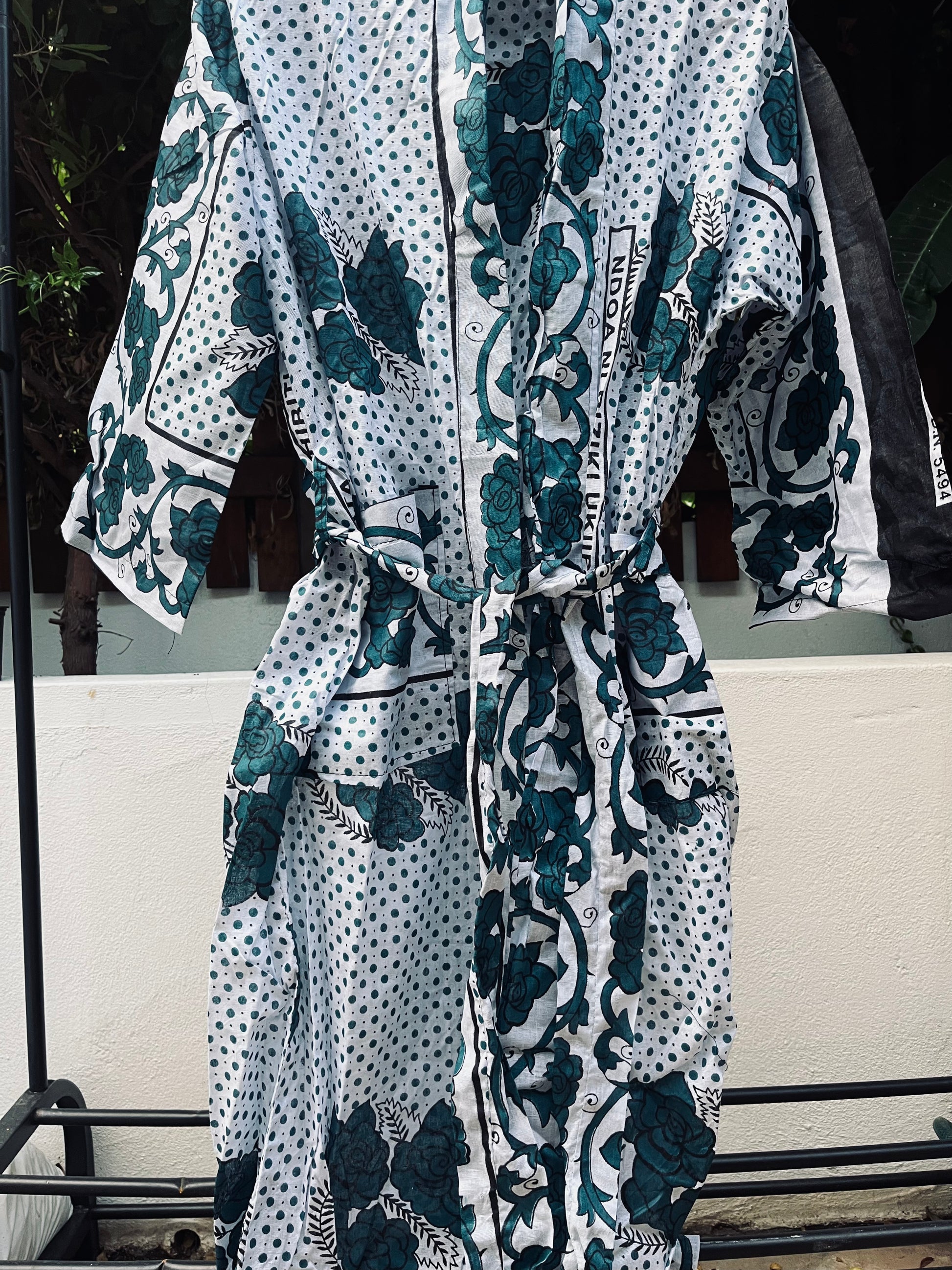 This refreshing Naku-mono kimono brings the lush beauty of a green forest to life with intricate patterns in green, black and white. Individually handcrafted from authentic block-printed wax cotton kanga in Zanzibar.